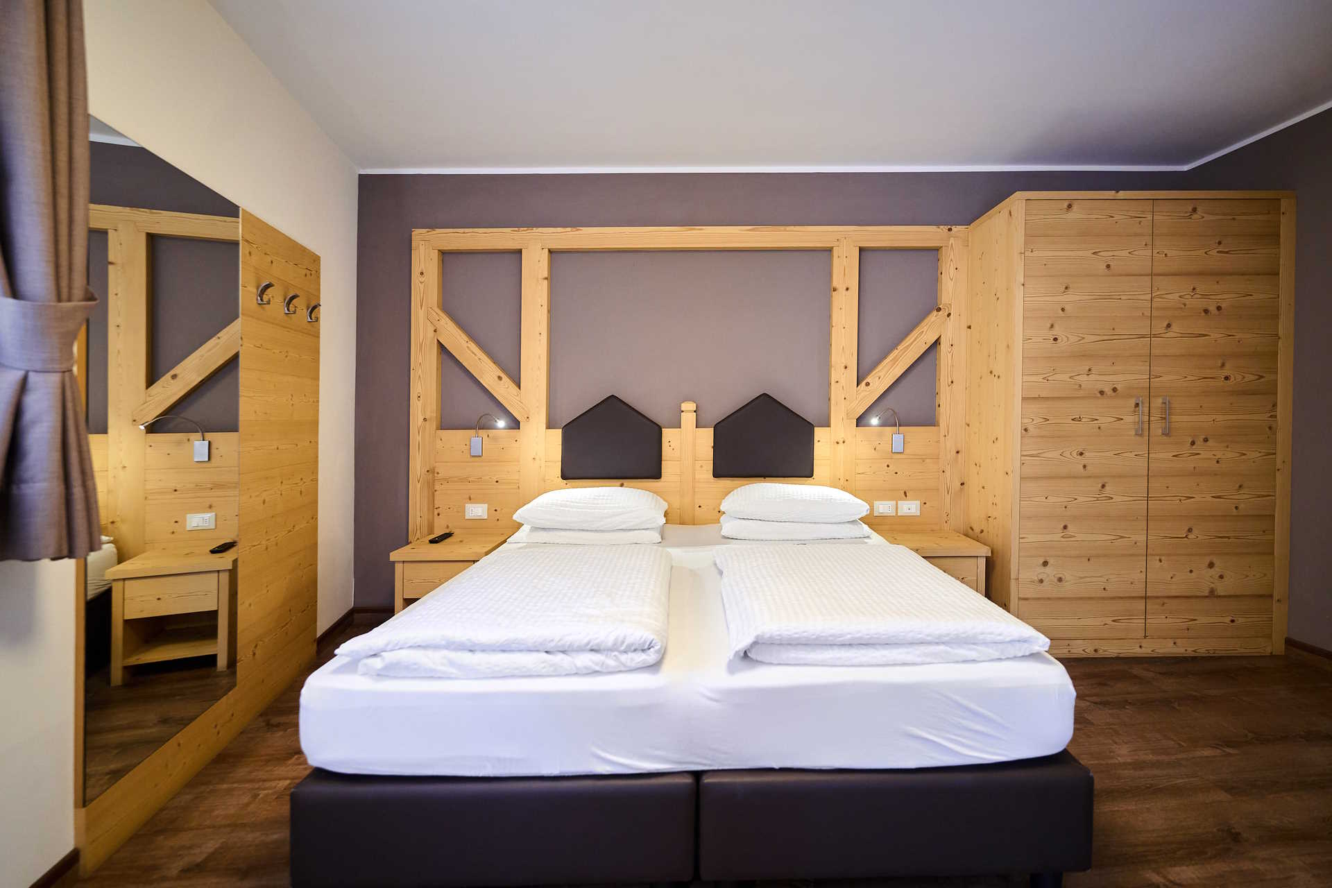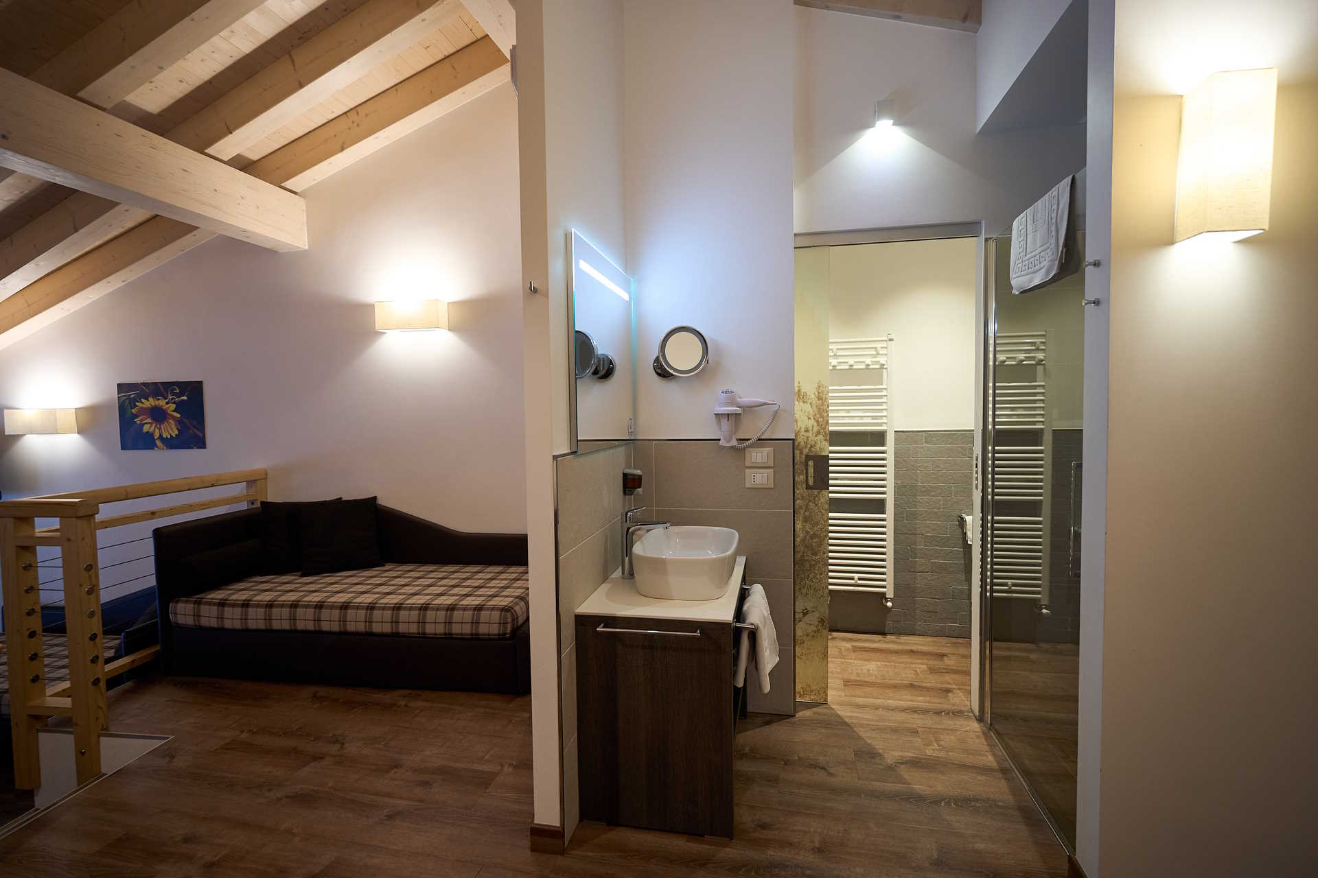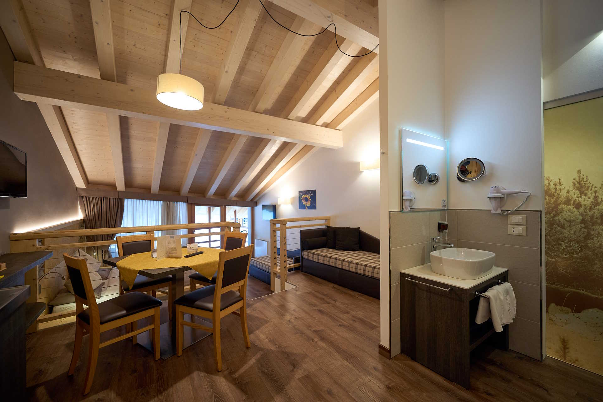 At DolceVita Ambiez Rooms&Breakfast every stay is a unique experience, because our accommodations are all different. At guests’ disposal there are 3 bedrooms, 3 Studios and 4 suites, all furnished with natural materials. The 3 bedrooms are made of pine wood. We chose this essence because its scent improves the quality of sleep, relaxes and promotes psychophysical well-being. For the furnishings of the 3 studio apartments and 4 suites, however, we used fir, one of the most common materials in the woods surrounding San Lorenzo Dorsino. Fir is soft, easy to work with and is part of the artistic craftsmanship tradition of these areas. Why all this wood? First of all to create a warm and welcoming environment, typical of mountain homes. And then, because solid wood manages to regulate the humidity in the air in a natural way, preventing the formation of microorganisms and moulds.