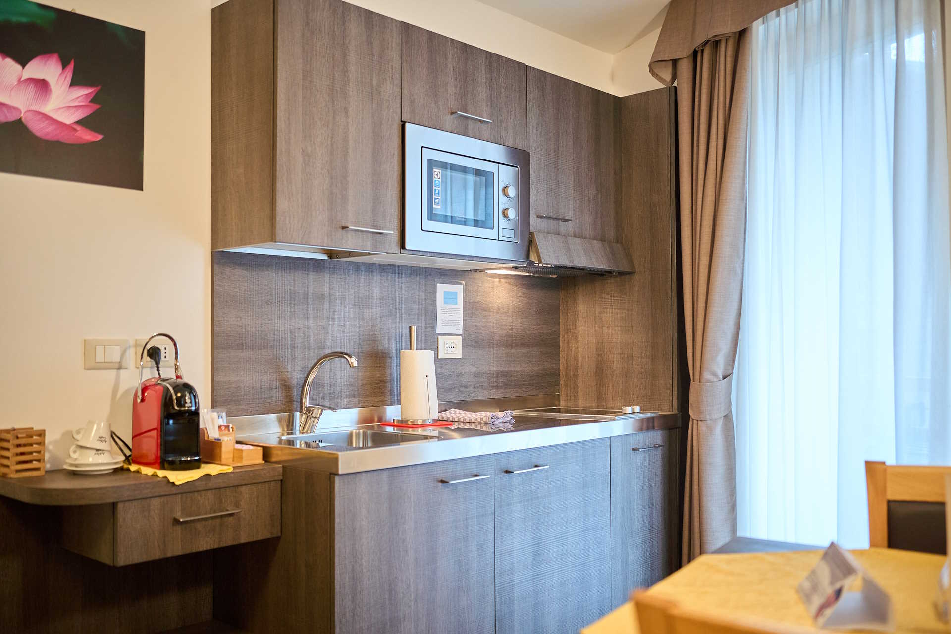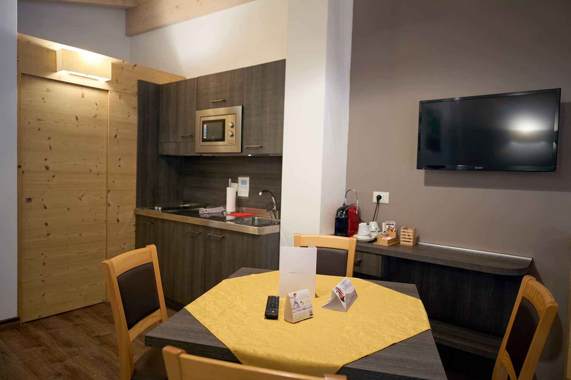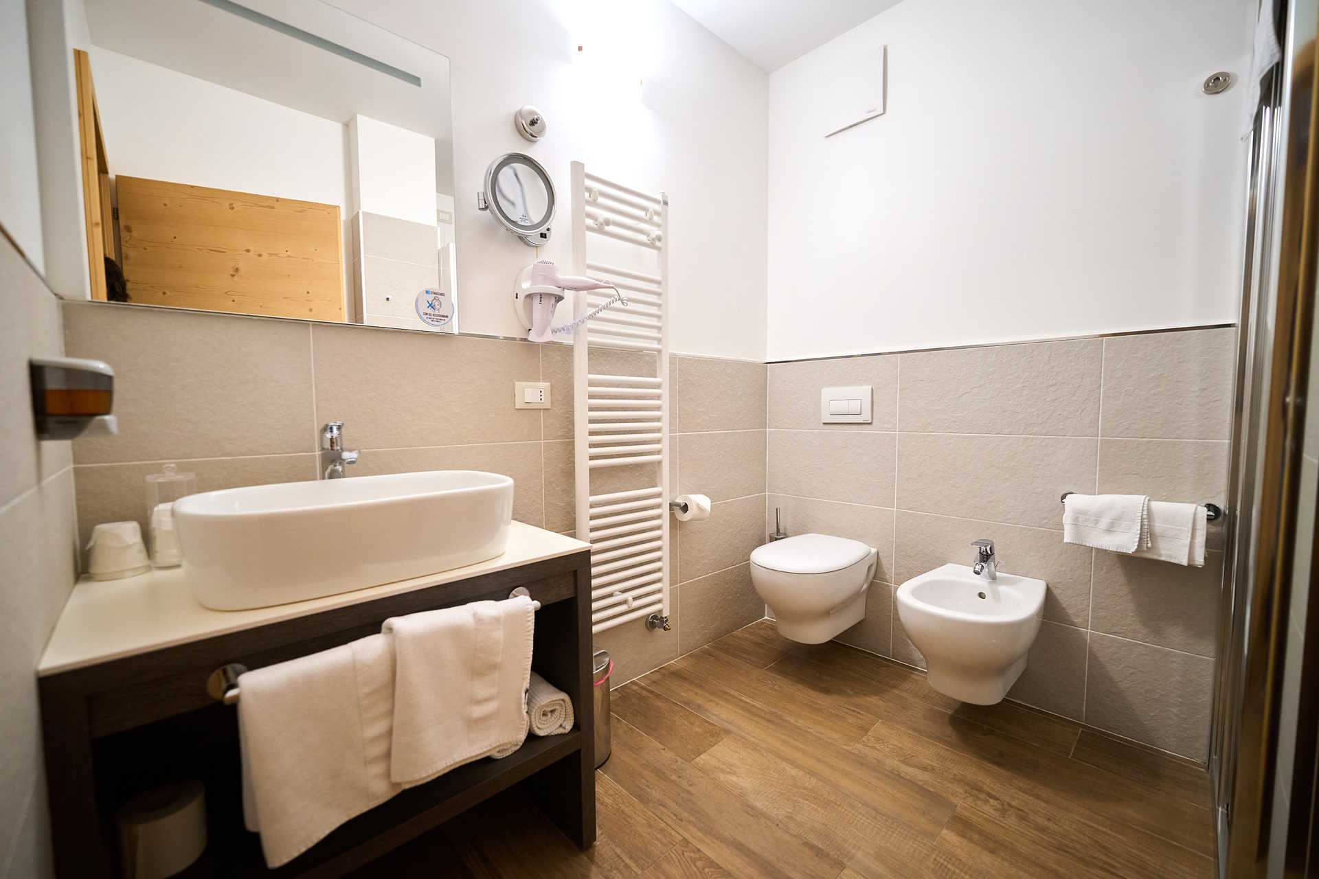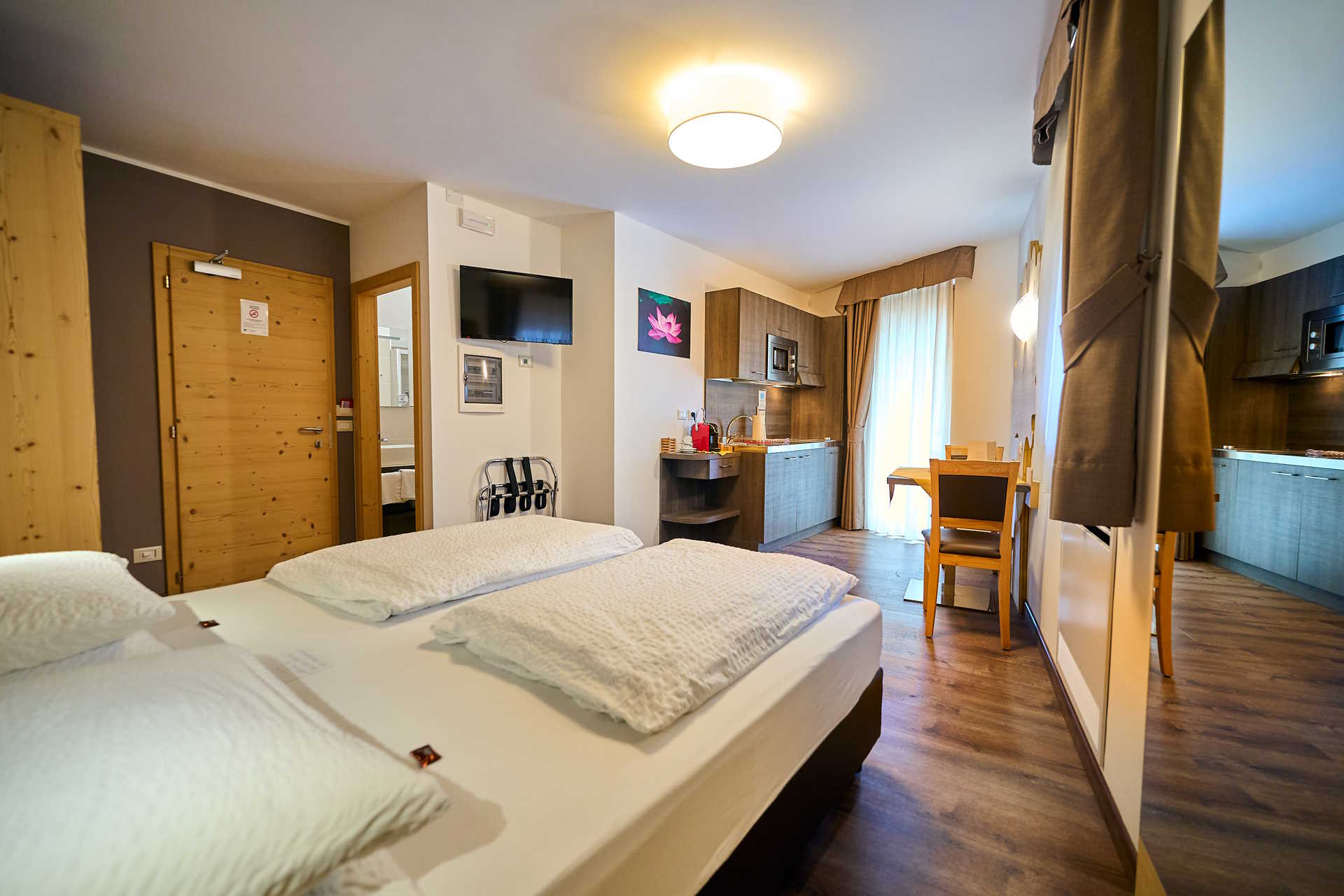 At DolceVita Ambiez Rooms&Breakfast every stay is a unique experience, because our accommodations are all different. At guests’ disposal there are 3 bedrooms, 3 Studios and 4 suites, all furnished with natural materials. The 3 bedrooms are made of pine wood. We chose this essence because its scent improves the quality of sleep, relaxes and promotes psychophysical well-being. For the furnishings of the 3 studio apartments and 4 suites, however, we used fir, one of the most common materials in the woods surrounding San Lorenzo Dorsino. Fir is soft, easy to work with and is part of the artistic craftsmanship tradition of these areas. Why all this wood? First of all to create a warm and welcoming environment, typical of mountain homes. And then, because solid wood manages to regulate the humidity in the air in a natural way, preventing the formation of microorganisms and moulds.